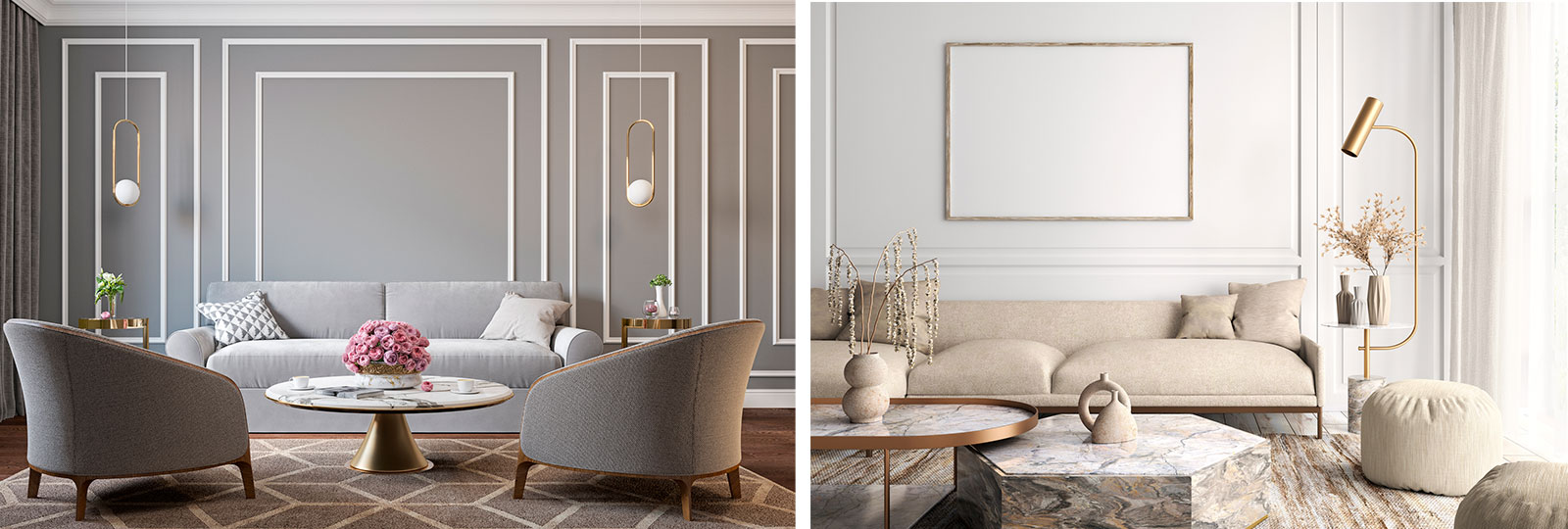 Es por ello por lo que podemos ver combinaciones de molduras y otros elementos decorativos más típicos del clasicismo con muebles actuales de líneas depuradas.